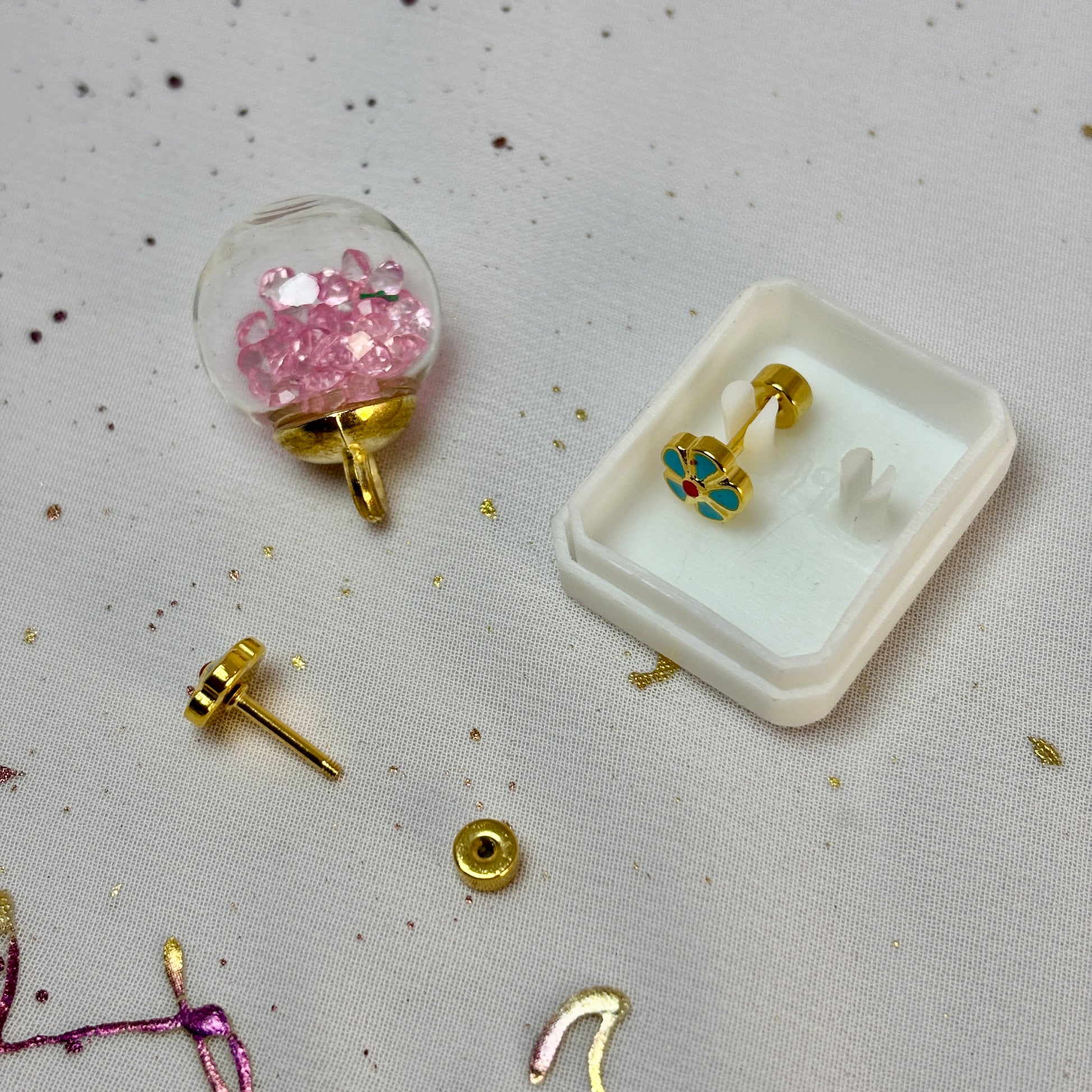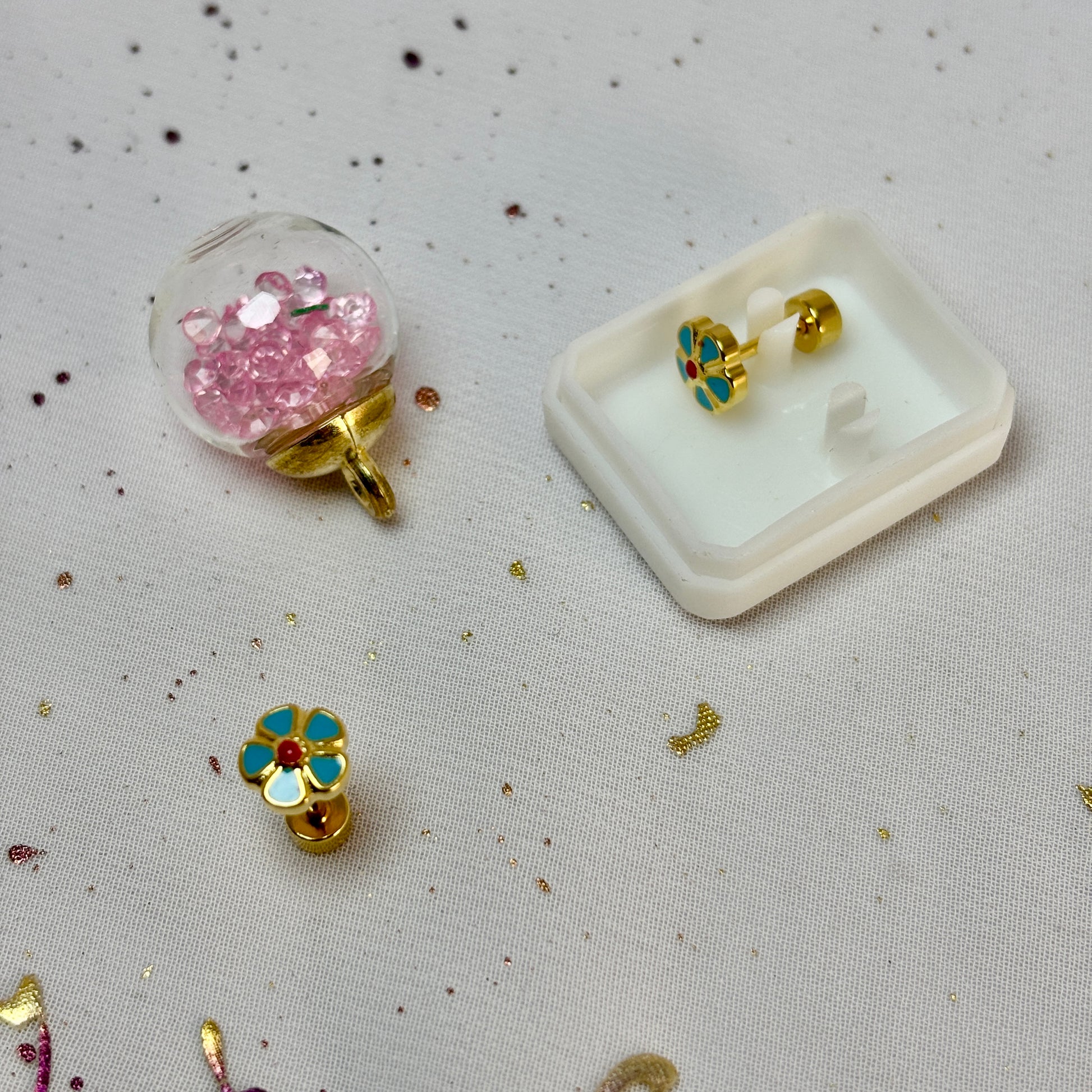 Mini Aros Acero Quirúrgico Dorado Flor Azul - Tope Tornillo
