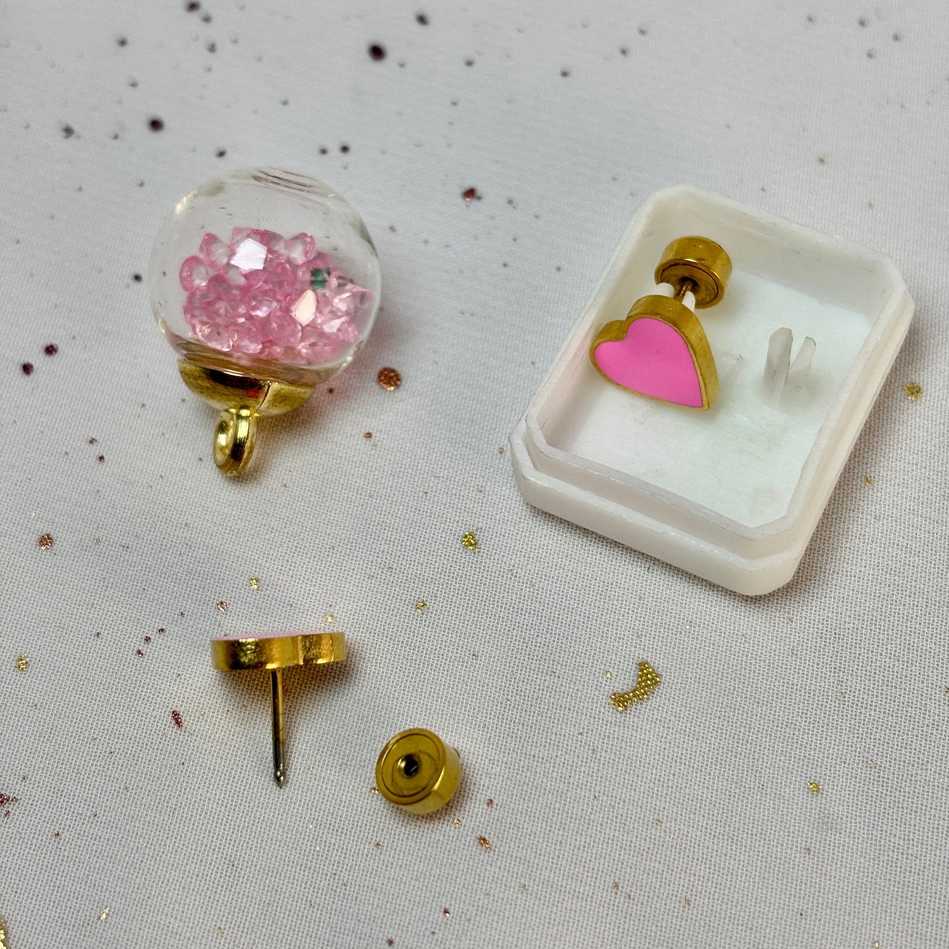 Mini Aros Acero Quirúrgico Dorado Corazón Rosa - Tope Presión Abridor