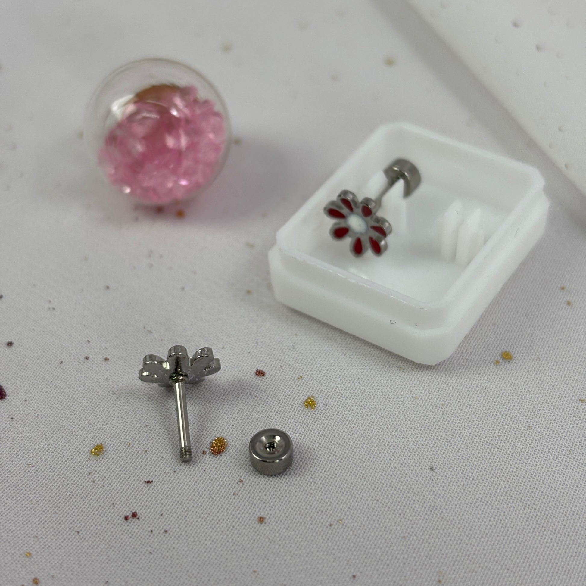 Mini Aros Acero Quirúrgico Plateado Flor Roja - Tope Tornillo