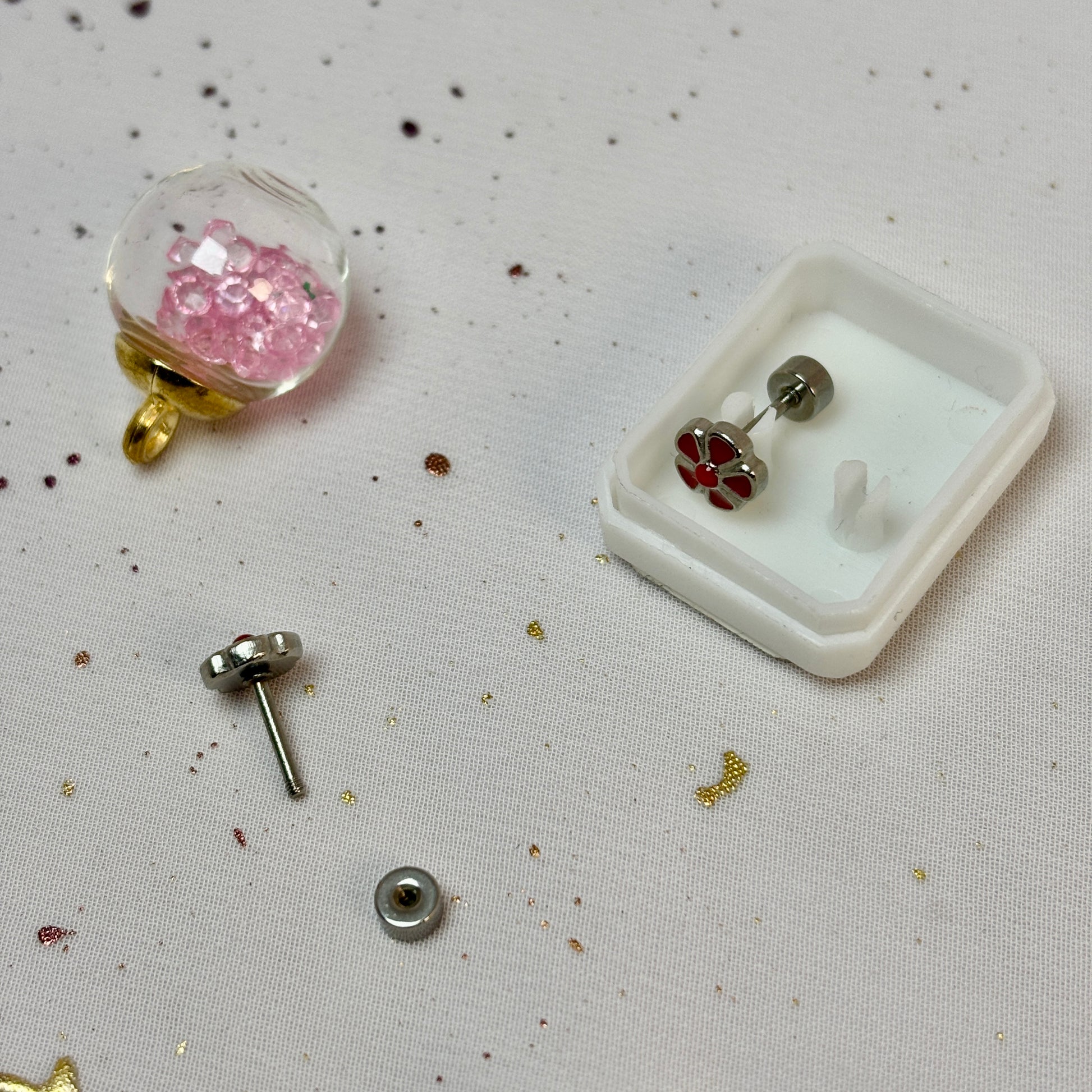 Mini Aros Acero Quirúrgico Plateado Flor Rojo - Tope Tornillo